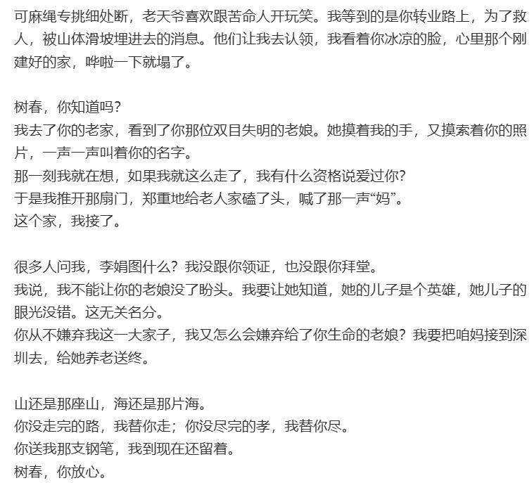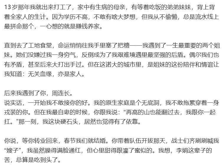 董晴替李娟写了很多话给她和她的姐妹;给那个说好要回来娶她,却永远留在山那边的周树春连长。最后谢谢姐妹们陪李娟熬过低谷,谢谢周连长让李娟见过光。更是谢谢大家喜欢李娟,喜欢这个有点倔、有点“傻”,浑身是劲儿的东北姑娘。
